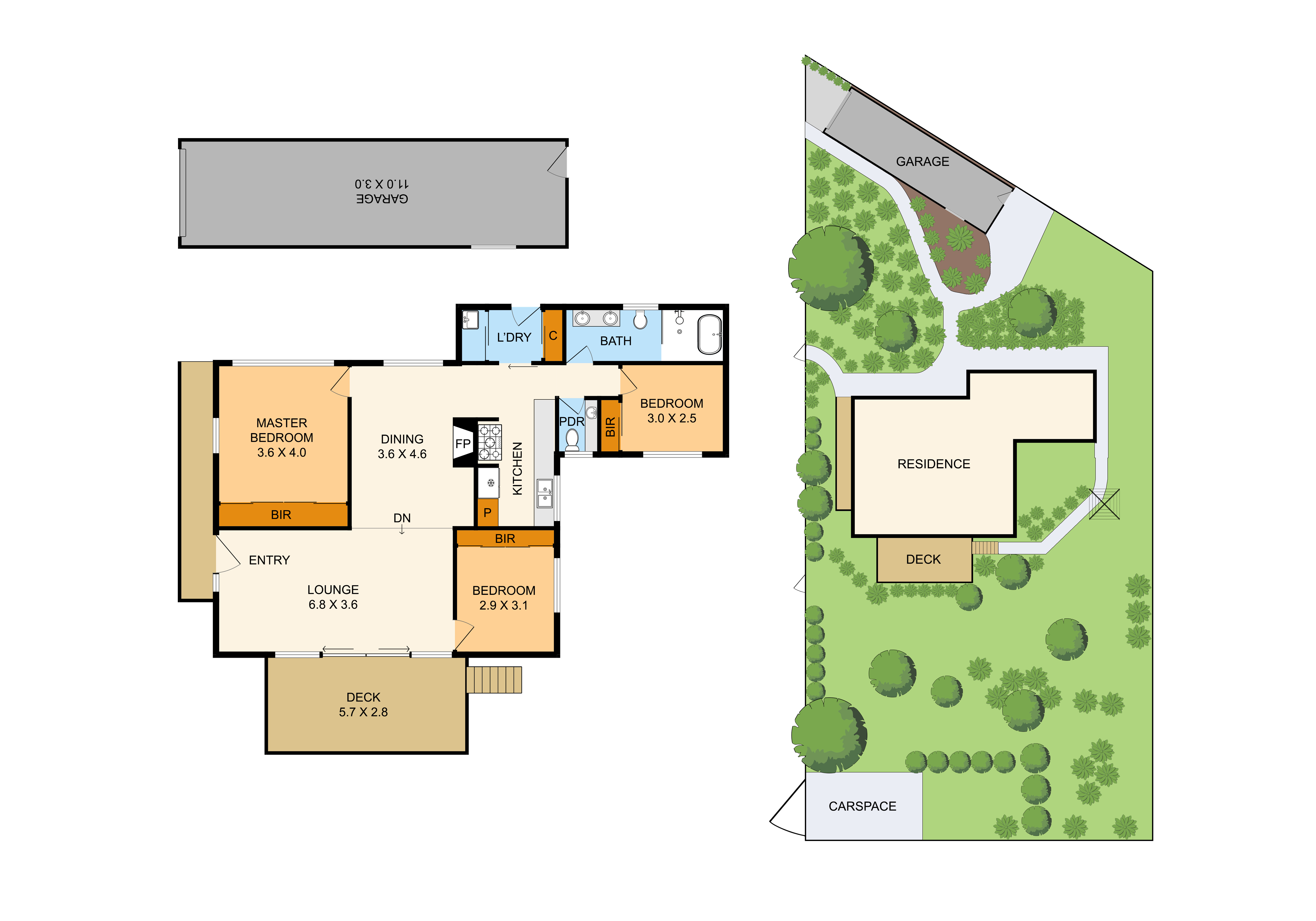 • Outside alfresco, with timber decking and streamline wire balustrade that melts away into the tree canopy backdrop