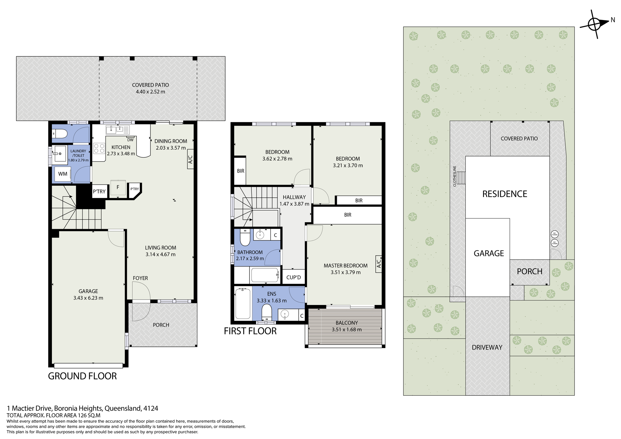 Upstairs, all three bedrooms include built-in wardrobes, with the master suite offering an ensuite, air-conditioning, and access to a private balcony. The main bathroom and a separate linen cupboard provide additional comfort and functionality.